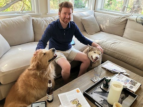 FYI, I wear my dogs like socks. They surround me as I write this. Look at my daughter’s dog, this golden retriever. One brain cell, maybe two. A retriever? She couldn’t retrieve a meatball if you left it in a warm wad of fries.