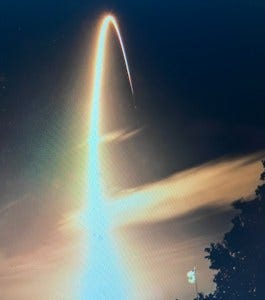 On a walk the other night, Puddles and I spot the popcorn vapor trails from a Vandenberg launch. Dusk. Heat. Galileo. Harps.