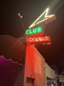 Captions: Most of these are the grandkids or White Fang. The winter scene is from the 395 coming out of Mammoth Lakes. The person in the lower right isn’t a person at all, actually; it’s AI creation Tilly Norwood, who needs an AI boyfriend. The neon joint is 1881, the cozy and beloved Pasadena jazz joint.